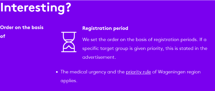 Be aware of the fact that there is a housing shortage at the moment, there are not enough rooms for everyone. We advise you to also look for other housing options! The priority does not guarantee that you will find a room before the start of the academic year.