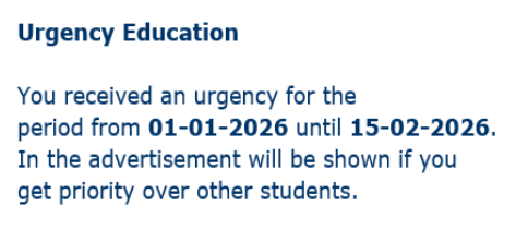 It can take months before a student finds their first room. Because you are a first year student living further from campus than 130 kilometers, you will be provided with a priority status on your account. This priority goes into effect on the 1st of January 2026 and will last until the 15th of February 2026. This priority is a one-time offer you will not be receiving it again and it will expire as soon as you sign a contract with Idealis. It is in this time period that we will also be publishing the available rooms that should be of interest to you.